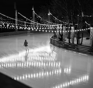 A real or synthetic ice rink, indoor or outdoor, in the heart of your shopping center or on a roof or on a fountain or elsewhere, in any season.